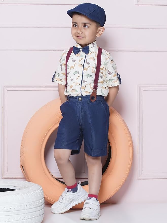 - FEATURES: The Printed-patterned shirt has a front button closure, half sleeves, and a spread collar, paired with denim shorts featuring a partial elastic waistband, button, and zipper closure, and two pockets, The set also comes with a matching suspender with an elasticated strip pattern, a stylish bow, and a cap