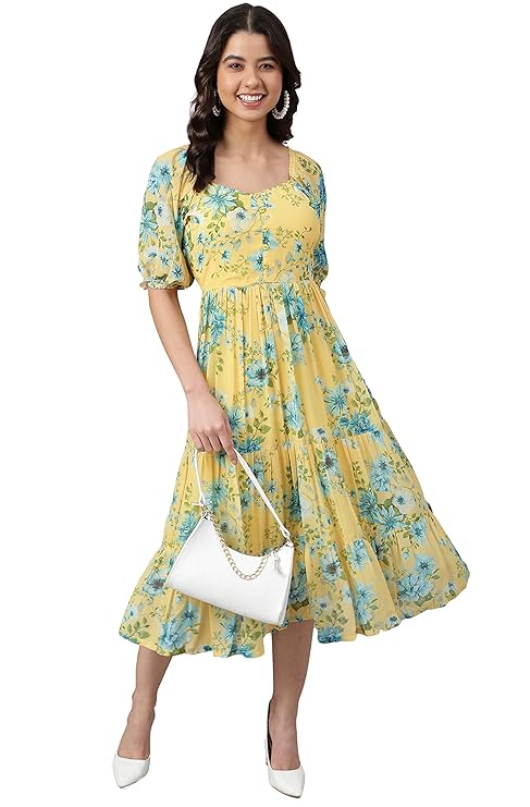 - Style:- Length: 43(inch) | Pattern: Floral Print | Occasion: Casual | Type: Flared | Sleeve Type: 3/4 Sleeve( Puff Sleeve) | Color: Yellow